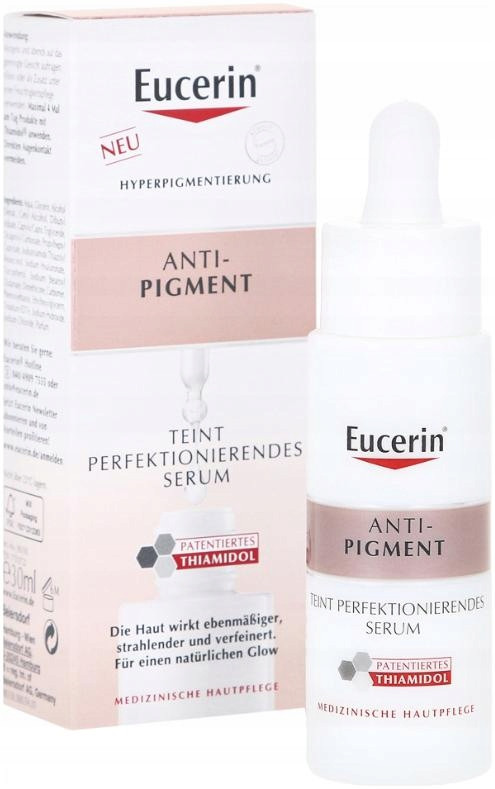 Rozjaśniające serum korygujące Eucerin AntiPigment sprawi, że już po 2 tygodniach Twoja skóra będzie bardziej rozjaśniona. Dzięki zawartości tiamidolu redukuje przebarwienia bezpośrednio w miejscu ich powstawania. Skóra pozostaje ujednolicona kolorystycznie, gładsza w dotyku oraz bardziej miękka.