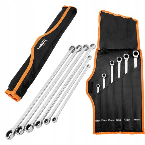 Klucze oczkowe z grzechotką, długie, zestaw 6 sztuk, 8-19 mm, miękkie etui 09-370 NEO to zestaw profesjonalnych narzędzi, oferowanych w solidnym, miękkim etui z możliwością zwijania oraz wygodnego przechowywania. Komplet zawiera 6 sztuk kluczy oczkowych z grzechotką oraz z długą rękojeścią w rozmiarach: 8, 10, 13, 16, 17 i 19 mm. Narzędzia wykonane zostały z trwałej stali chromowo-wanadowej. Ich mechanizm zapadkowy wyposażony jest w 72 zęby. Klucze wyróżniają się wyjątkową trwałością i przeznaczone są do wymagających zadań, pod znaczącymi obciążeniami.