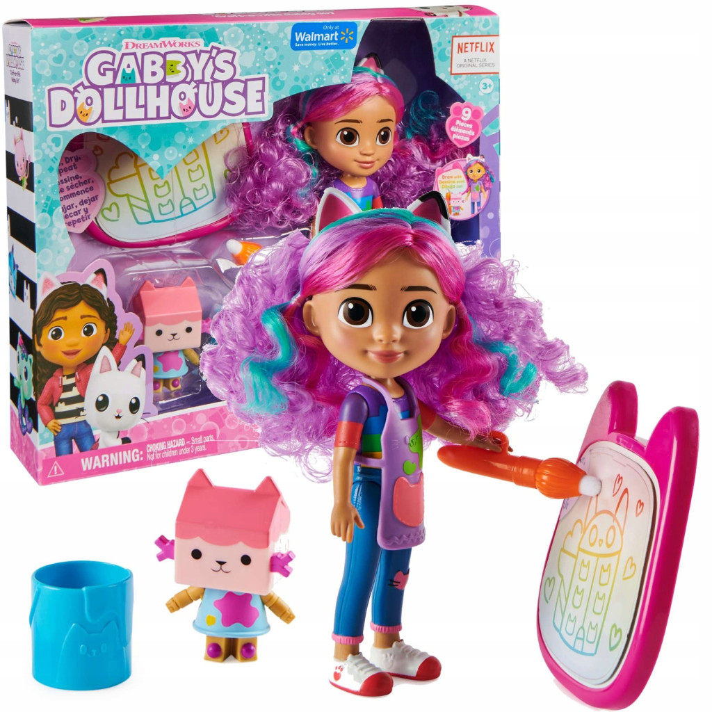 Zestaw do malowania wodą pozwala na niekończącą się zabawę wraz z bohaterami bajki. Produkt składa się z dużej lalki Gabi, kotka o imieniu Tekturzątko oraz akcesoriów, dzięki którym dziecko poczuje się jak prawdziwy artysta. Wlej wodę do wiaderka, maluj i wysusz, aby użyć ponownie!