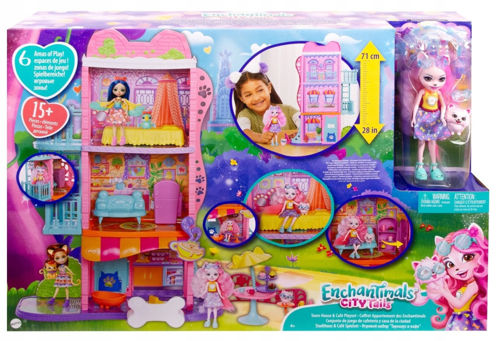 Dzięki temu zestawowi do zabawy Enchantimals™ Miejski domek z kawiarenką możesz bawić się w wielkim stylu! Zestaw o wysokości 70 cm ma 6 obszarów zabawy, zapewniając całe mnóstwo możliwości wymyślania magicznych historyjek. Znajdziesz tu też lalkę Palmer Pomeranian™ (15 cm) i jej pieska Pommy™. Odkryj 3 poziomy zabawy: kawiarenkę z patio, salon z kuchnią, sypialnię oraz „basen” na dachu. Są tu też balkon, schody przeciwpożarowe i otwierane drzwi (z klapką dla pieska Pommy™). Ta urocza para przyjaciół uwielbia zapraszać innych przyjaciół Enchantimals™ do swojego miejskiego domku. To idealne miejsce na spędzanie czasu w mieście! Wśród akcesoriów są łóżko, kanapa, otwierana lodówka, „napoje”, „desery” i nie tylko, więc masz wszystko, czego potrzebujesz, aby wraz z przyjaciółmi Enchantimals™ świetnie się bawić, odpoczywać i przeżywać miejskie przygody. Kolory i elementy dekoracyjne mogą się różnić.
