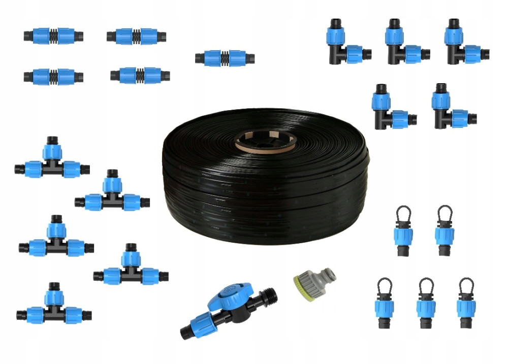 Do zaoferowania mamy Państwu, wielosezonową taśmę kroplującą do nawadniania o średnicy 16mm z emiterem co 10cm grubość 8mil długość 100m z zestawem 22 akcesoria