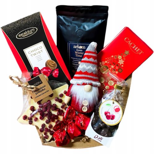 Świąteczny kosz prezentowy zawierający świeżo paloną kawę w towarzystwie wyjątkowych i przepysznych rarytasów w postaci czekolad o różnych kształtach oraz pralinek o różnorodnych smakach. Dopełnieniem zestawu jest uroczy krasnal świąteczny, będący miłym upominkiem. Zestaw na pewno sprawi radość osobie, którą chcemy obdarować i pozwoli poczuć czarowną atmosferę świątecznych dni.