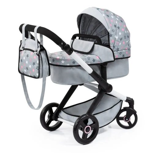 Śliczny wózek szarej kolorystyce, w gwiazdki, zachwyci każdą "małą mamę"