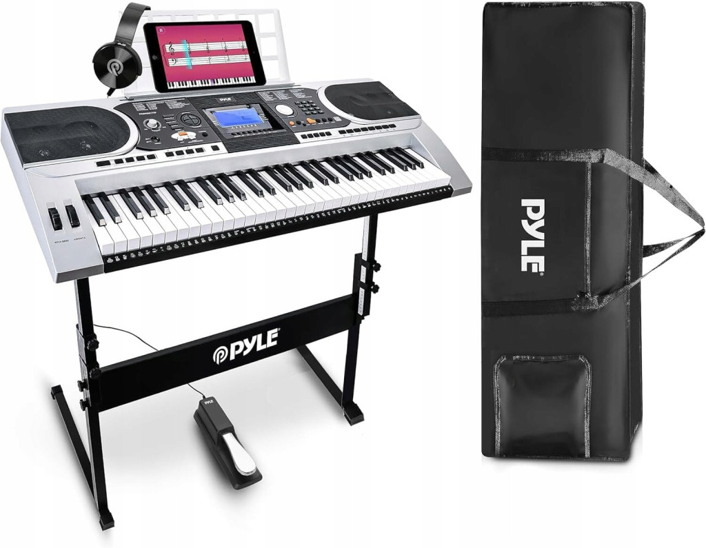 Pełen zestaw: W skład zestawu wchodzi torba na klawiaturę, stołek, statyw, pedał sustain, uchwyt na nuty, adapter, wtyczka zasilająca i słuchawki, co zapewnia dodatkową wygodę.