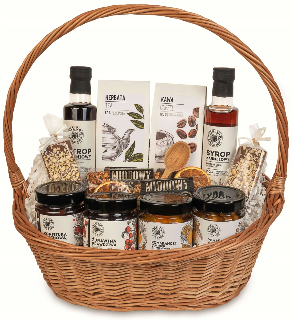Zanurz się w świecie owoców w syropie, aromatycznej kawy, herbaty i czekolady dzięki naszemu wyjątkowemu wiklinowemu koszowi prezentowemu.