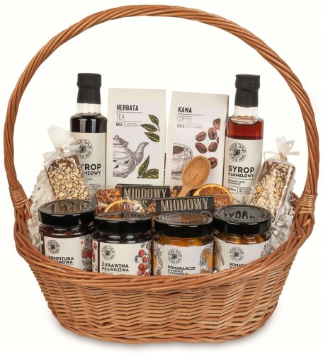 Ten kosz to kompozycja najlepszych smaków, starannie dobranej kawy, herbaty oraz owoców w syropie, które dodadzą słodkości każdemu dniu. Ekskluzywne czekoladki z owocami oraz syropy doskonale dopełniają całość, tworząc idealny zestaw dla każdego smakosza. Wyrafinowane dodatki, jak drewniana łyżka czy elegancki kosz, czynią ten prezent jeszcze bardziej wyjątkowym.