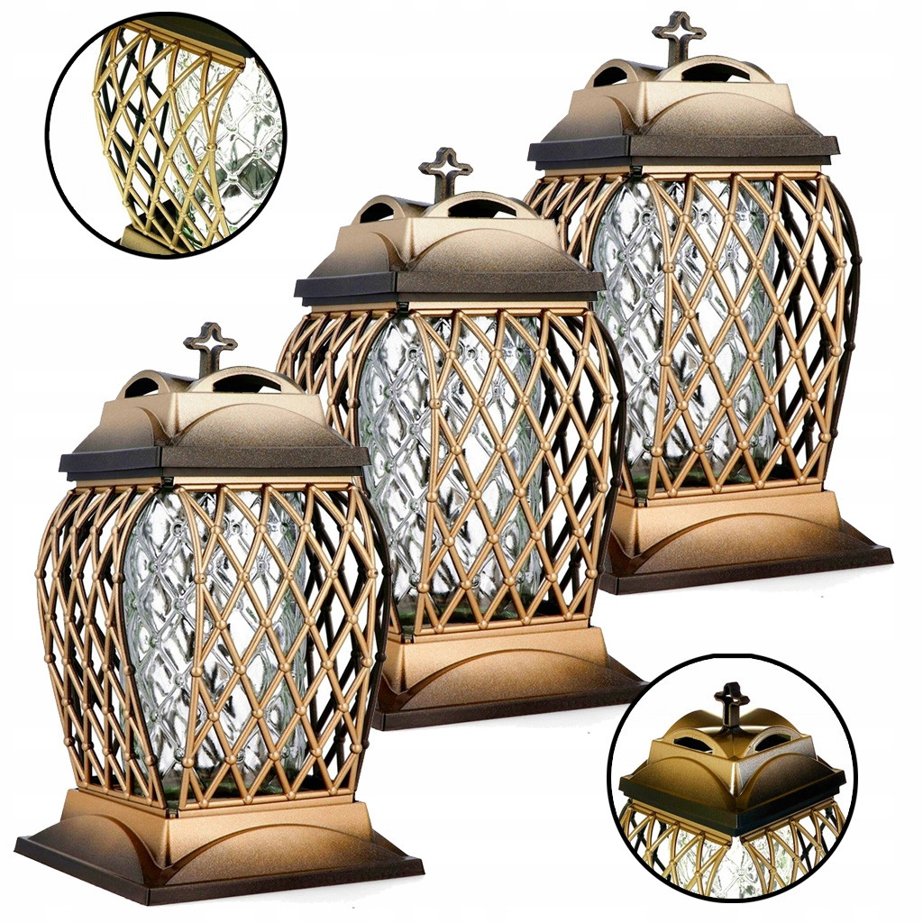 Dekoracyjny znicz nagrobny o subtelnej, delikatnej formie, wyposażony w podstawkę i złoty kapturek. Jego elegancki design oraz precyzyjne wykonanie sprawiają, że stanowi wyjątkowy symbol pamięci.