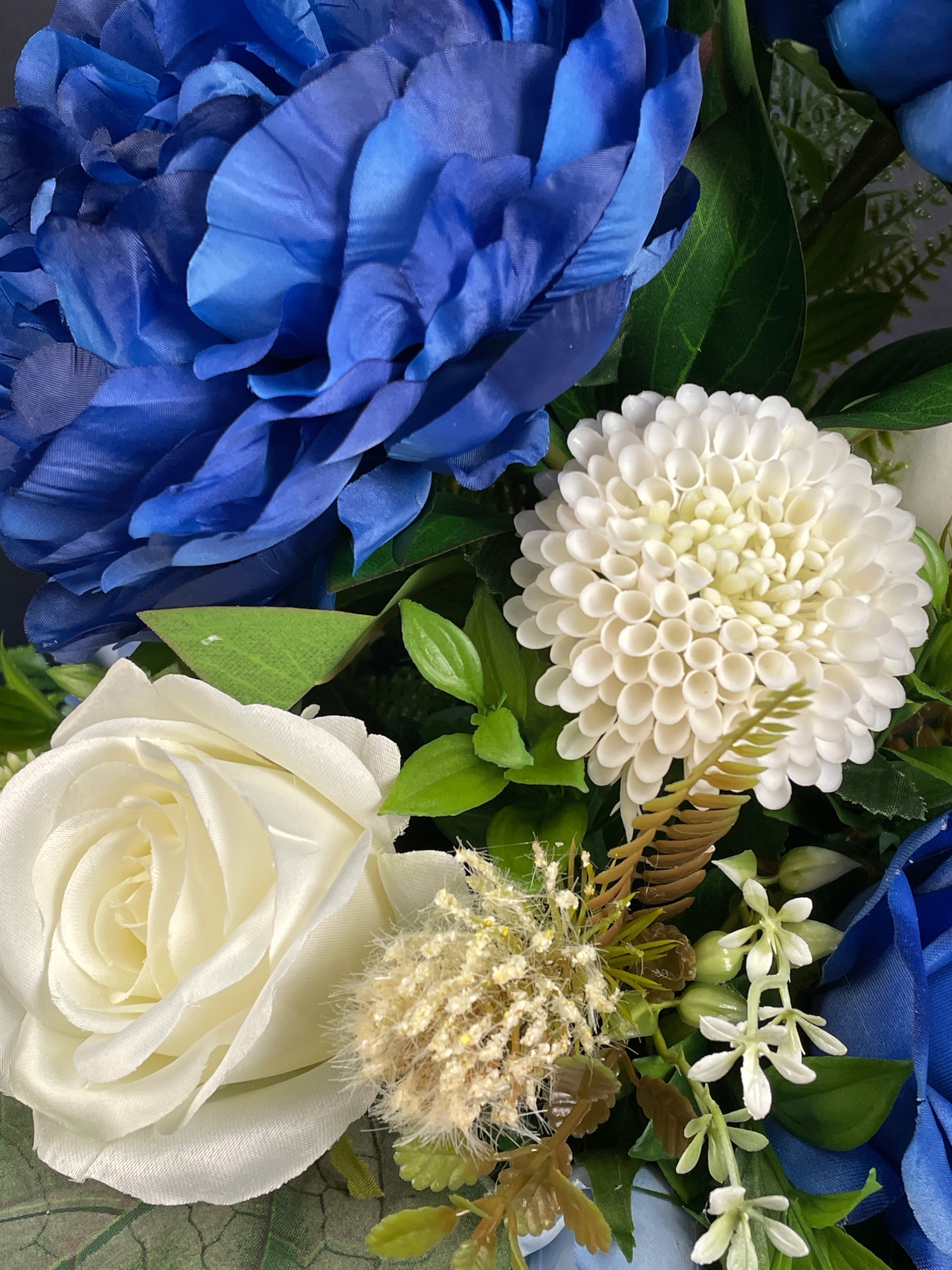 Całość utrzymana jest w niezwykle dostojnej i zarazem subtelnej kolorystyce, gdzie biel symbolizuje spokój i czystość duszy, a błękit i granat nawiązują do wiary, nadziei oraz wieczności. To zestawienie kolorów wprowadza atmosferę zadumy, powagi i głębokiego szacunku wobec zmarłych.