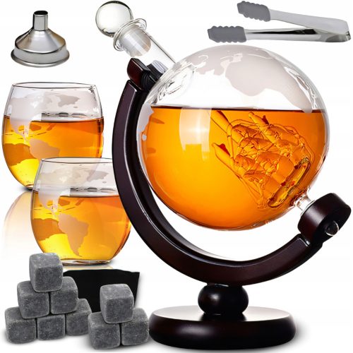 ⭐ Duży zestaw do whisky ⭐ Efekt globusa ⭐ Ręczne wykonanie ⭐ Mocna i solidna konstrukcja ⭐ Drewniana podstawka w kształcie półksiężyca ⭐ Bezpieczne przechowywanie ⭐ Łatwe uzupełnianie ⭐ Idealny na prezent ⭐ Pojemna karafka i szklanki ⭐ 9x kamiennych kostek do drinków ⭐ Luksusowy design ⭐
