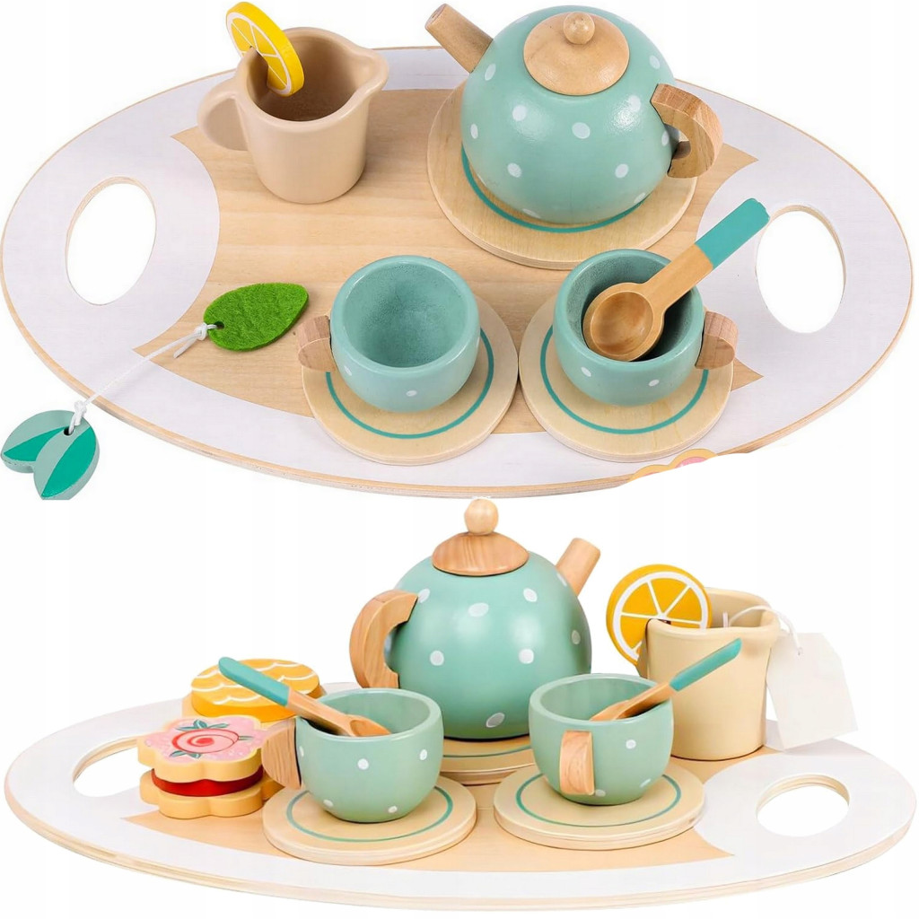 Wykonany z bezpiecznego i trwałego drewna zestaw zawiera wszystko, co potrzebne do organizacji udanego popołudniowego tea party, w tym eleganckie filiżanki, łyżeczka, babeczki i wiele innych akcesoriów.
