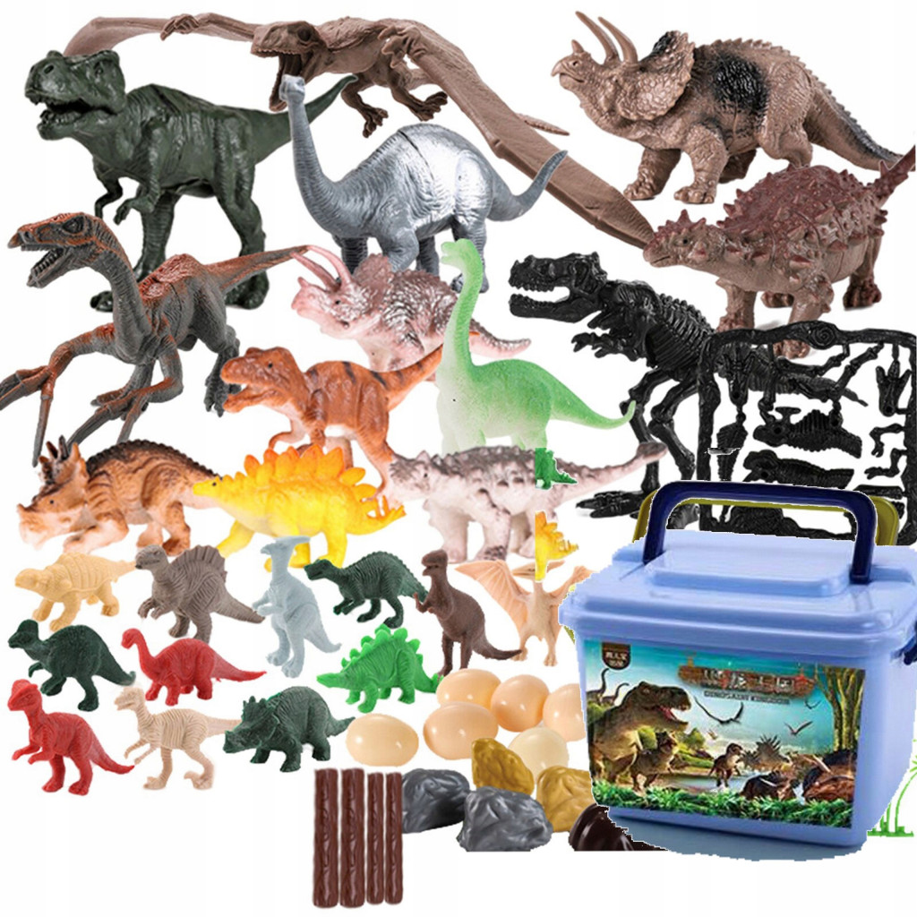 Świat prehistorycznych dinozaurów znajduję pasjonatów zarówno u mniejszych dzieci jak i tych większych. Ich różnorodny wygląd sposób obcowania w przyrodzie zdumiewa a czasem budzi grozę. Po mimo tego że dinozaury możemy obejrzeć już tylko na filmie zabawki którymi dzieci się bawią często odwzorowują ich wygląd i pozwalają przenieść się w te czasy historii i stworzyć w zaciszu własnego pokoju prawdziwy Park Jurajski.Zestaw składa się z dinozaurów o różnej wielkości co sprawia że podczas zabawy można odgrywać różne rolę i walki między dinozaurami. Oprócz dinozaurów zestaw zawiera również 6 duże jajka dinozaura wyglądające bardzo realistycznie, skały drzewka ogrodzenie idealnie wpasują się w klimat zabawy.