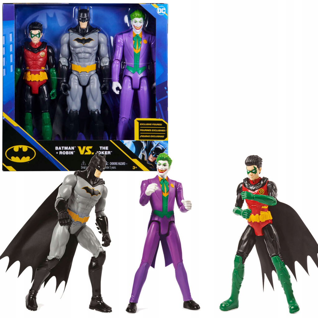 Zestaw 3 figurek przedstawia bohaterów uniwersum DC Comics, takich jak: Batman, Robin oraz Joker.