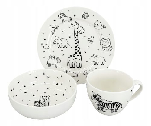 Zestaw obiadowy dla dzieci ZOO, 3 szt. - talerz ø 20cm, miska ø 14cm, filiżanka o pojemności 220 ml, materiał porcelanowy, kolor biały, czarny wystrój zwierząt.