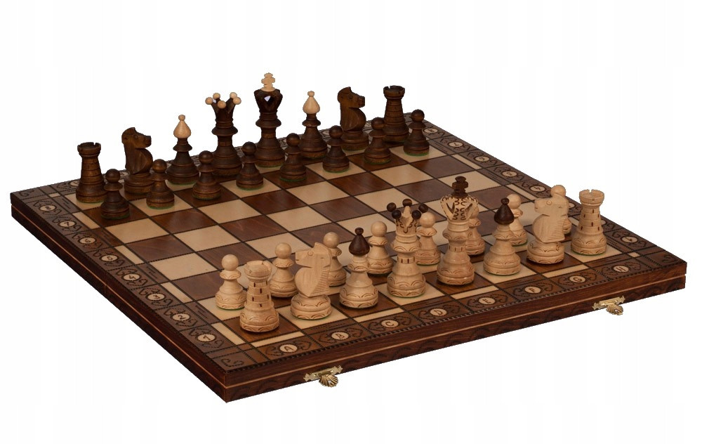 Szachy AMBASADOR wykonane są w całości z drewna. Figury szachowe są podklejane filcem oraz zdobione wzorami.