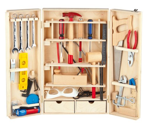 Bardzo funkcjonalny i bogato wyposażony zestaw narzędziowy Leomark dla młodych stolarzy i mechaników.