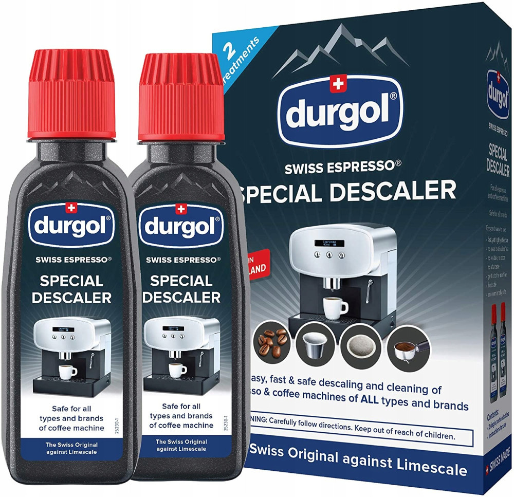 Durgol Swiss Espresso 2 x 125ml - profesjonalny odkamieniacz do wszystkich ekspresów automatycznych oraz pół-automatycznych w których istnieje sekwencja odkamieniania. Durgol czyści ekspresy do kawy wszystkich marek. Idealnie usuwa osady, kamień i konserwuje wewnętrzne elementy ekspresu.