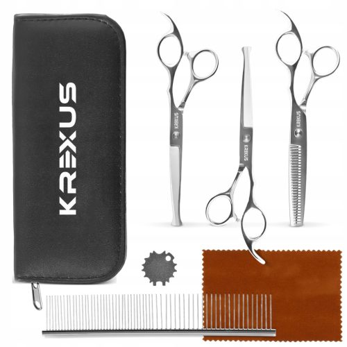 Nasz zestaw zawiera nożyczki proste, degażówki oraz zakrzywione, dzięki czemu możesz łatwo osiągnąć różne efekty i stylizacje na futrze Twojego zwierzaka.
