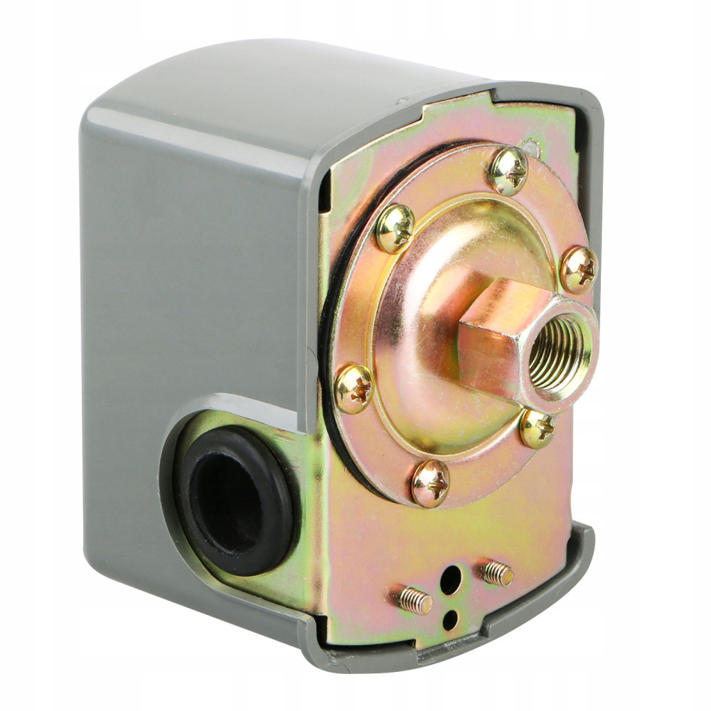 Solidna konstrukcja zapewnia długą i bezawaryjną eksploatację. Przyłącze 1/4" pozwala na bezproblemowy montaż lub wymianę. Dwie śruby regulacyjne pozwalają ustawić osobno ciśnienie załączania i wyłączania.