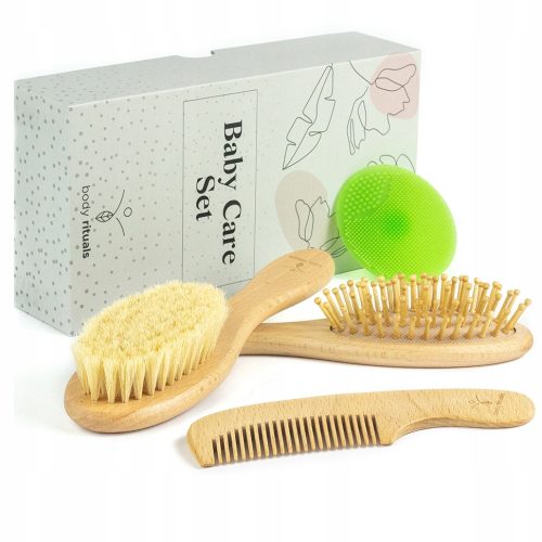 Zestaw akcesoriów do włosów Body Rituals Baby Care Set został stworzony specjalnie dla delikatnej skóry i włosów dzieci i niemowląt. Zapewnia wszystko, czego potrzebujesz, aby delikatnie rozczesać włosy Twojego malucha. Dodatkowo w zestawie znajduje się płatek silikonowy, który umożliwi w sposób bezbolesny i delikatny pozbyć się ciemieniuchy u niemowlaka. Akcesoria z zestawu wykonane są z najwyższej jakości materiałów, hipoalergicznych i wolnych od BPA. Całość zapakowana w urocze pudełko, dzięki czemu zestaw będzie doskonałym prezentem.