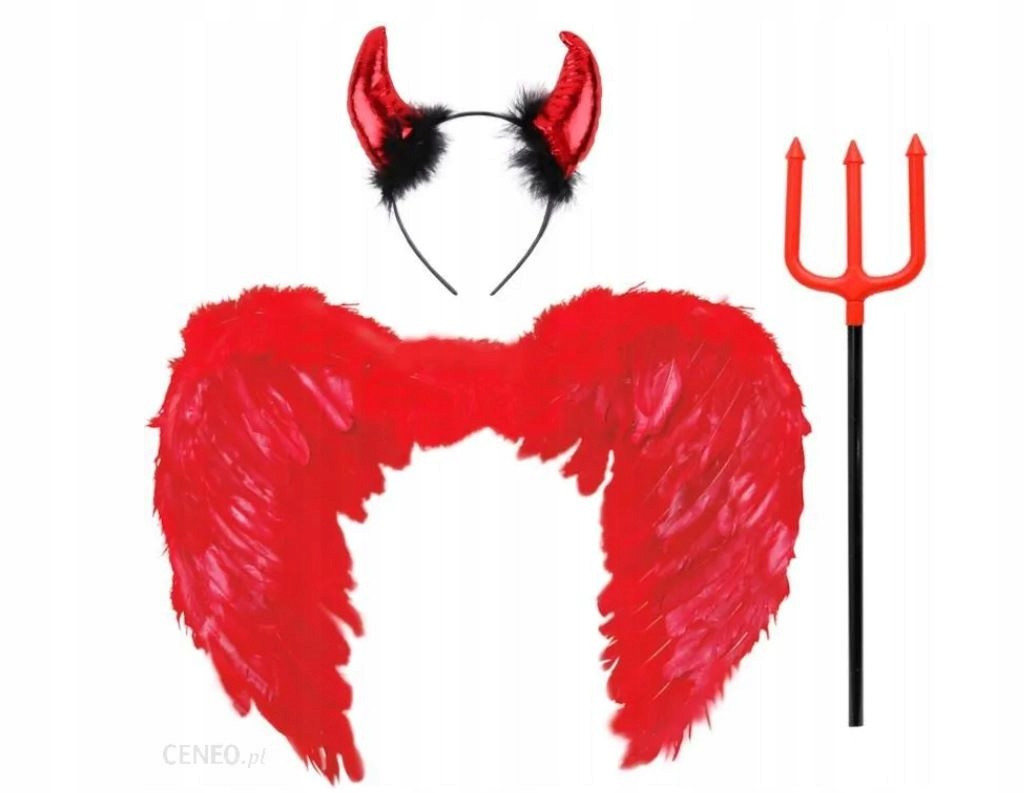 Fantastyczna opaska z czerwonymi rogami diabła i czarnym puszkiem,składane plastikowe widły diabła,czerwone skrzydła z piór