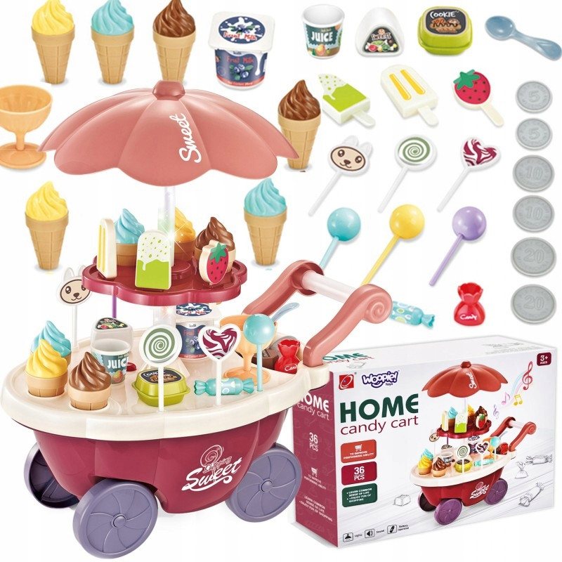 Wózek z Lodami będzie idealna zabawką dla Twojego maluszka i jego przyjaciół - nie tylko w upalne dni! Zabawka jest zapewnieniem kreatywnej zabawy, odgrywania ról, rozwija wyobraźnie i inne zdolności do prawidłowego rozwoju dziecka. Zabawa w "sprzedawcę" i "kupującego" pomoże rozwinąć świadomość i zdolności społeczne. Posiada wiele akcesoriów z najwyższej jakości dodatkami/naklejkami do zabawy "sprzedaży" ze szczegółowymi modelami rożków do lodów, patyczków do lodów, lizaków lodowych, słodkich lizaków z rysunkowymi twarzami oraz innymi elementami, jak kanapki, pudełka na słodycze i przekąski, pucharki na lody, pudełko popcornów i butelka na sok. Dodatkowo niezbędnymi elementami zestawu są pieniążki, które zachęca dzieci do nauki podstawowych umiejętności matematycznych i finansowych podczas dokonywania zakupów.