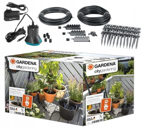 GARDENA automatyczna konewka - w pełni automatyczny system nawadniania kropelkowego dla maksymalnie 36 roślin doniczkowych. Posiada pompę, która poprzez transformator z włącznikiem czasowym zostaje uruchomiona raz dziennie na 1 minutę i zasila rośliny wodą z pojemnika, w którym jest umieszczona. Poprzez sieć rozdzielników i węży nawadniających woda trafia tam, gdzie jest potrzebna. Aby uwzględnić różnice w zapotrzebowaniu na wodę różnych roślin zastosowano tutaj 3 rozdzielniki o różnym wydatku wody, każdy z 12 wyjściami dla dokładnego jej dozowania - od 15 ml na minutę do 30 ml (maksymalnie 60 ml) na minutę. W zestawie znajduje się transformator z włącznikiem czasowym, pompa z filtrem, 3 rozdzielniki wody z 12 wyjściami kazdy, 9 m węża rozdzielającego, 30 metrów węża doprowadzającego wodę do roślin, 36 szpilek mocujących, 20 zaślepek.
