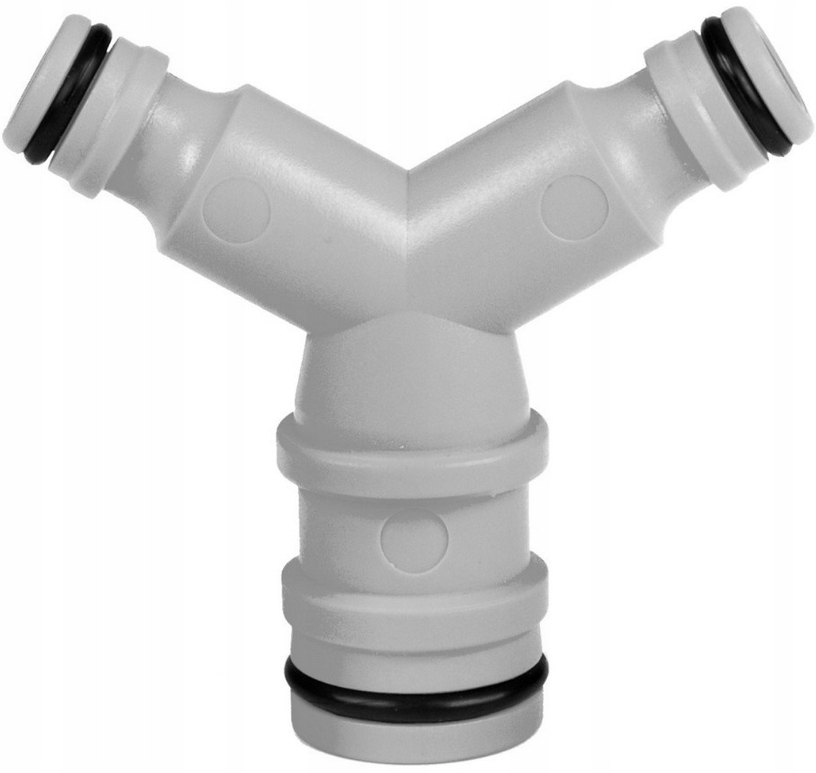 Łącznik do rozłącznego rozgałęzienia redukcyjnego węża 1" z dwoma wężami z zamontowanymi szybkozłączami 1/2" - 5/8" lub 3/4"