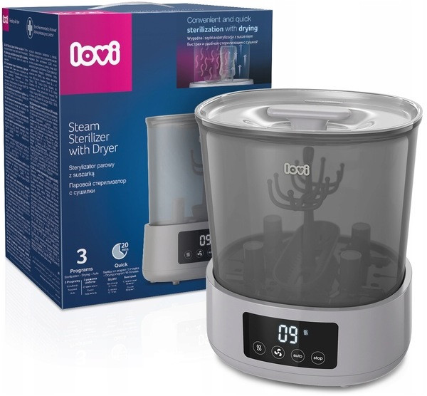 Elektryczny sterylizator parowy LOVI z suszarką to gwarancja bezpieczeństwa maluszka oraz wygoda i oszczędność czasu dla mamy. Stworzony przez markę LOVI sterylizator parowy jest innowacyjnym urządzeniem, które nie tylko sterylizuje, ale również suszy. Ponieważ ułatwienie opieki nad maluchem jest celem marki LOVI, elektryczny sterylizator parowy z suszarką posiada aż 3 programy.