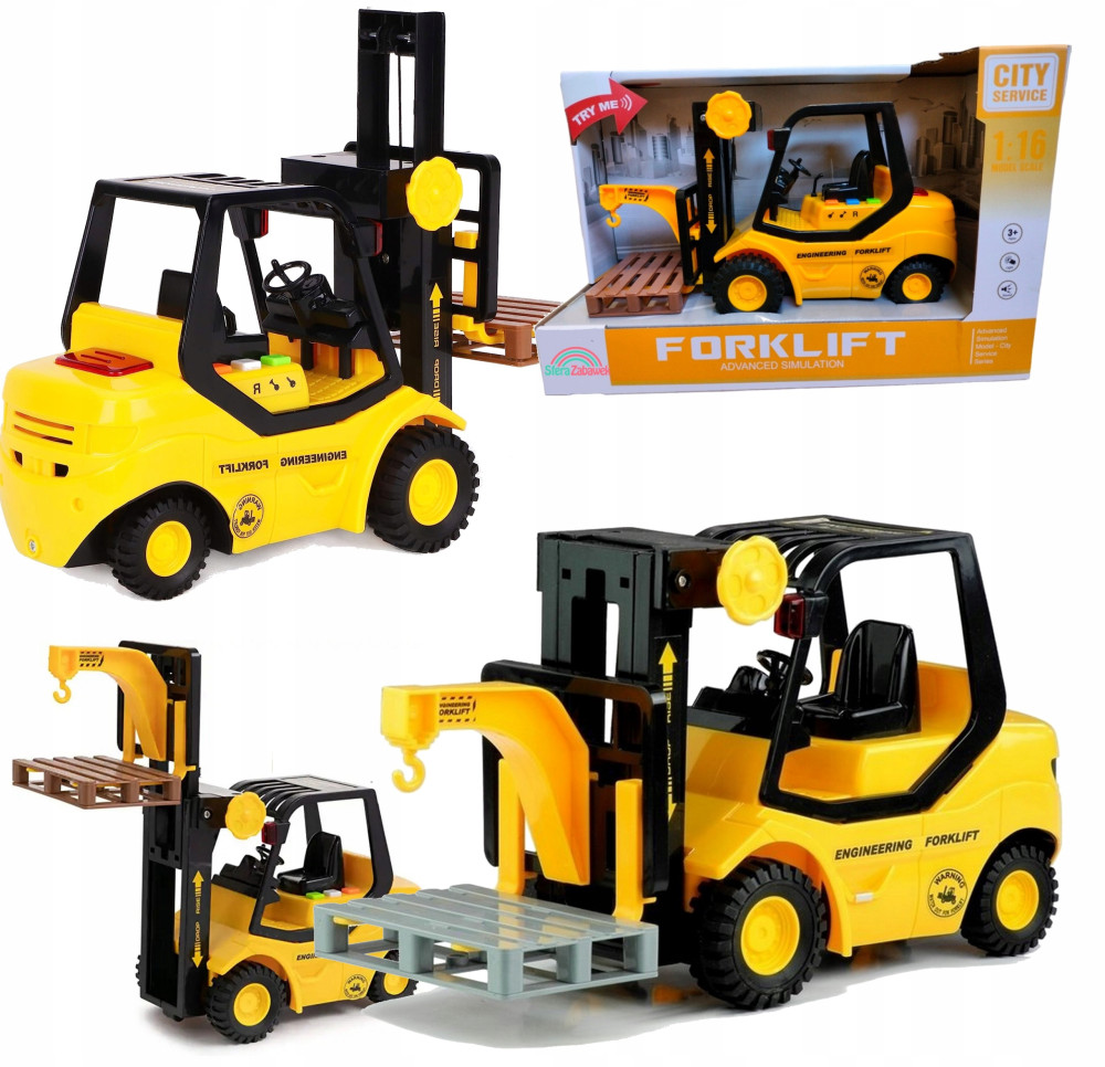 Zabawka utrzymana w kolorystyce żółto-czarnej, przypominającej prawdziwe pojazdy budowlane, zaskakuje dbałością o detale. Na desce rozdzielczej znajdują się kierownica, symulacje wskaźników i drążek zmiany biegów, a otwarta kabina operatora dodaje realizmu. Wózek porusza się za pomocą napędu frykcyjnego - wystarczy pociągnąć go do tyłu, by rozpocząć zabawę. Dodatkowo, wyposażony jest w przyciski odpowiadające za odpalanie silnika, klakson i sygnał cofania. Widły można regulować manualnie za pomocą korbki, co zwiększa możliwości zabawy.