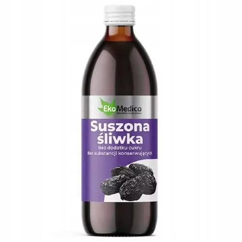 Suszona śliwka – płynny suplement diety, wyprodukowany z soku 100% z owoców suszonej śliwki z dodatkiem naturalnej witaminy C pochodzącej z ekstraktu z owoców camu-camu. Pasteryzowany. Bez dodatku cukru- zawiera naturalnie występujące cukry.