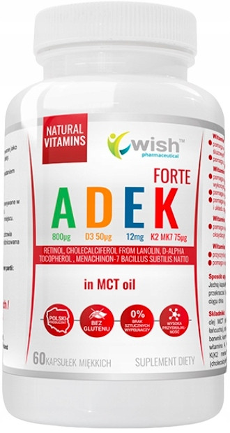 olej MCT (trójglicerydy o średniej długości łańcucha), (żelatyna, gliceryna, woda, barwnik-karmel), witamina E (d-alfa tokoferol), witamina A (retinol), witamina K2 (Menachinon-7 Bacillus subtilis natto), witamina D3 (cholekalcyferol z lanoliny).