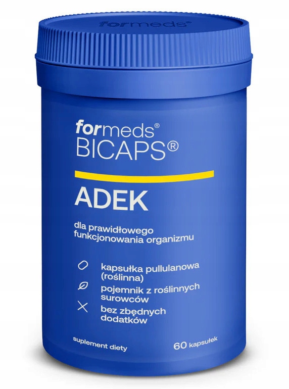 Suplement diety BICAPS® ADEK zawiera kompozycję witamin A, D, E i K, w tym witaminę A z marchwi, mikrokapsułkowaną witaminę K i wegańską, mikrokapsułkowaną witaminę D.