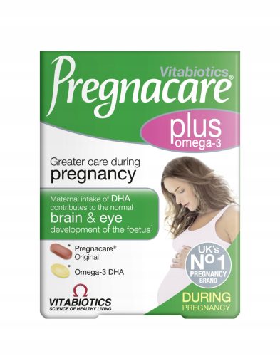 Vitabiotics Pregnacare Plus Omega-3 56 tabletek/kapsułek - to suplement diety, ktery łączy w sobie oryginalną formułę tabletek Pregnacare, z wysokiej jakości kapsułkami omega-3 (300 mg DHA), w wygodnym opakowaniu 2 w 1, do stosowania przez cały okres ciąży. Każda wolno rozpuszczająca się tabletka dostarcza niezbędnych witamin i składnikw mineralnych, w tym zalecane do spożycia ilości 400 g kwasu foliowego i 10 g witaminy D. Żelazo oraz witaminy B6 i B12 przyczyniają się do prawidłowej produkcji krwinek czerwonych. Spożycie kwasu dokozaheksaenowego (DHA) przez matkę przyczynia się do prawidłowego rozwoju oczu i rozwoju mzgu u płodu i niemowląt karmionych piersią. Każda kapsułka dostarcza 300 mg kwasu dokozaheksaenowego DHA (poziom zalecany przez wielu międzynarodowych ekspertw (Międzynarodowe Towarzystwo Badań nad Kwasami Tłuszczowymi i Lipidami - International Society for the Study of Fatty Acids and Lipids - ISSFAL).