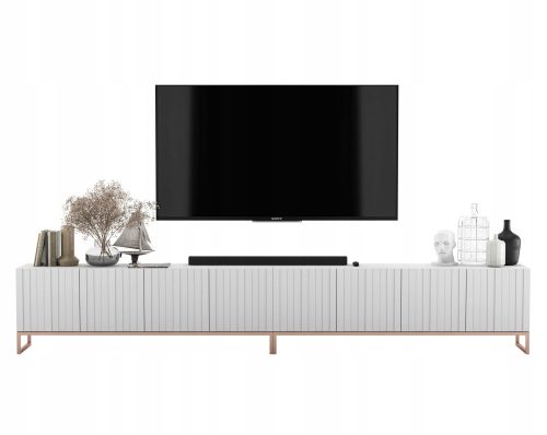 Dwie szafki RTV w stylu Glamour z kolekcji ELPIS, idealnie nadają się pod telewizor oraz dodadzą każdemu wnętrzu niepowtarzalnej elegancji. Umieszczone obok siebie tworzą jeden długi, bardzo ładnie prezentujący się mebel. Posiadają cztery funkcjonalne, zamykane komory z podziałem na dwa poziomy. System "push to open" do otwierania drzwiczek zapewnia estetyczny wygląd szafki, ze względu na brak widocznych uchwytów. Występuje również możliwość regulacji wysokości półek, która pozwala na dostosowanie przestrzeni do indywidualnych potrzeb. Meble z tej kolekcji wyróżniają się na tle innych szafek RTV ryflowanymi frontami, które podkreślają nowoczesny i elegancki wygląd szafek.