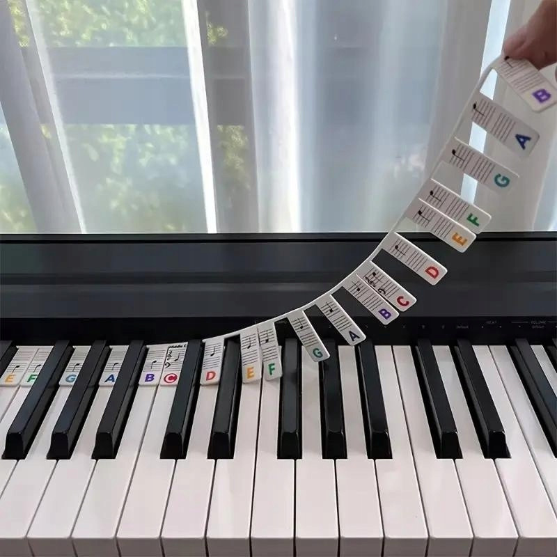 Świetne narzędzie do nauki dla początkujących muzyków. Wysoce elastyczny silikon nie przeszkadza podczas gry. Nie trzeba go przyklejać i w razie potrzeby można najzwyczajniej usunąć etykiety z klawiatury instrumentu bez konieczności odklejania i czyszczenia klawiszy tak jak w przypadku naklejek. Cała nakładka jest podzielona na trzy oddzielne części, które umieszczamy na klawiaturze. Na każdej etykiecie jest informacja o nazwie dźwięku oraz gdzie ten dźwięk znajduje się na pięciolinii.