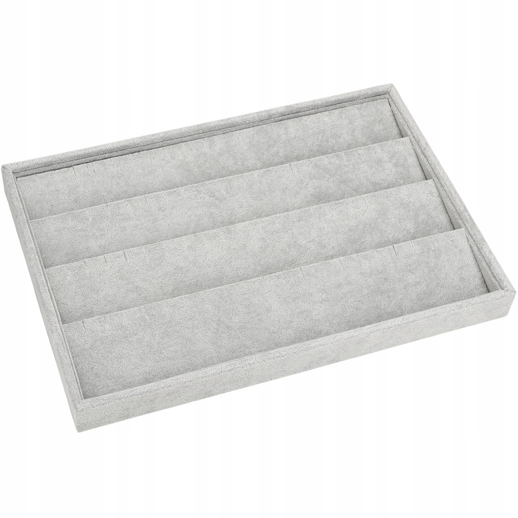 Elegancka i funkcjonalna taca na biżuterię. Wypełniona miękkim materiałem, w kolorze szarym. Posiada miejsce na kolczyki.