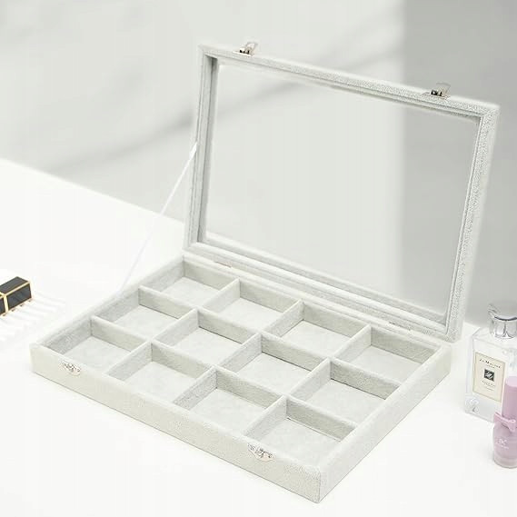 Zamiast plastikowej pokrywy, używamy grubego, przezroczystego szklanego okienka na górze pudełka na biżuterię, które pozwala zobaczyć całą biżuterię na pierwszy rzut oka.