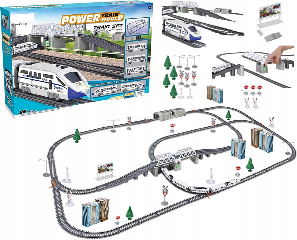 Kolejka elektryczna na baterie wpływa na pobudzenie wyobraźni oraz kreatywność dziecka. Lokomotywa została zaprojektowana w sposób bardzo realistyczny, odwzorowana jest na prawdziwą kolejkę. Kolejka po włączeniu samodzielnie porusza się po torach, ciągnąc za sobą doczepione wagony. Zestaw zawiera również most z tunelem, którym możemy sterować za pomocą przycisku, można otwierać lub zamykać przejazd. W zestawie znajduje się aż 86 elementów, które można układać według własnych upodobań, w dowolnej konfiguracji. Nie zawsze tor musi wyglądać tak samo, co dodatkowo uatrakcyjni zabawę! Na torze znajdują się dźwignie, dzięki którym możemy zmienić trasę maszyny. Elementy kolejki jak i pociągu łączymy za pomocą specjalnych haczyków. Dla jeszcze lepszej zabawy w zestawie znajdują się również drzewka, znaki, most z podnoszonym ramieniem, wagoniki, pociąg. Bardzo długi tor, długość całkowita toru to 9 metrów. W górnej części pociągu znajduje się przycisk, który odpowiada za prędkość.