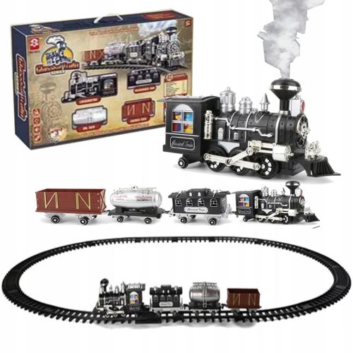 >W zestawie znajduje się tor z 39 elementami , lokomotywa, 3 wagony towarowe, dozownik do nalewania wody