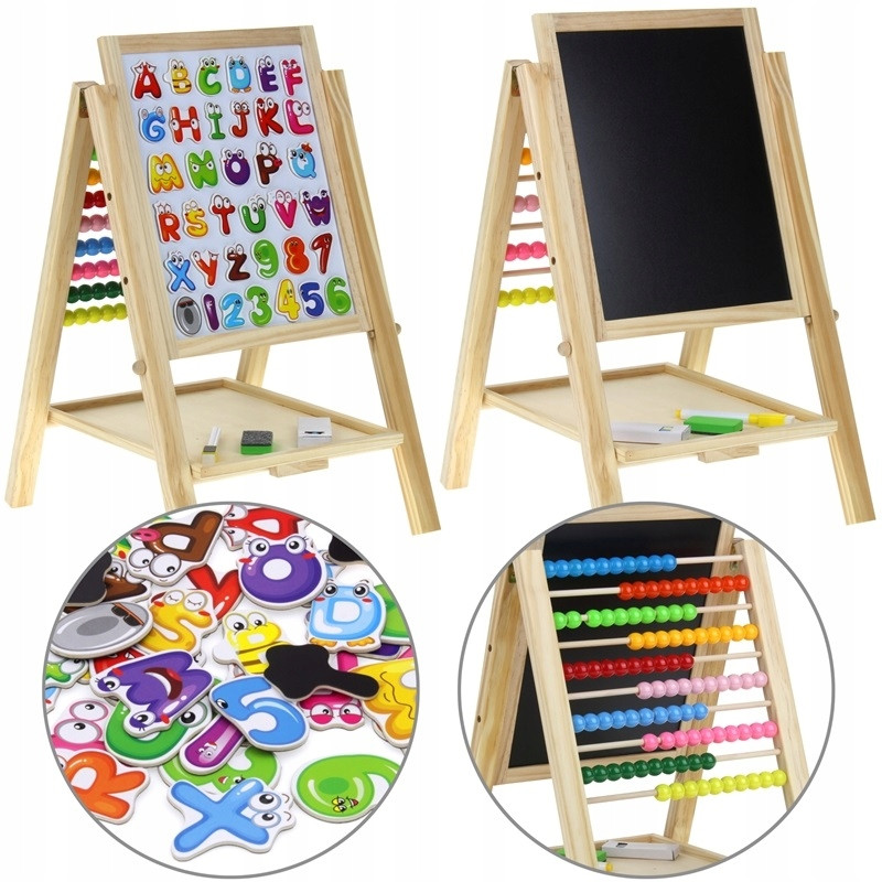 Dzieci uwielbiają bawić się w szkołę, której nieodłącznym elementem jest tablica. Dzięki niej Twoje dziecko może rozwijać swoje zdolności plastyczne, ćwiczyć naukę pisania oraz liczenia. Z jednej strony tablicy znajduje się powierzchnia do pisana kredą, z drugiej magnetyczna powierzchnia do pisania mazakami. Po zakończonej zabawie tablicę można złożyć, dzięki czemu zajmuje mało miejsca. Wyposażona jest w poręczną półkę na akcesoria. Solidnie wykonana z tworzyw najwyższej jakości. Starannie wykończona, dzięki czemu nie posiada ostrych krawędzi.