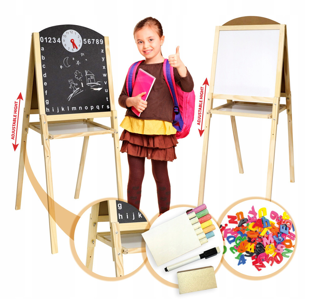 Drewniana tablica dwustronna jest świetną zabawką dla najmłodszych. To idealne miejsce do ćwiczenia w pisaniu pierwszych literek czy cyferek. Dzięki możliwości szybkiego zmazania maluch może ćwiczyć rysowanie tyle razy ile to konieczne.