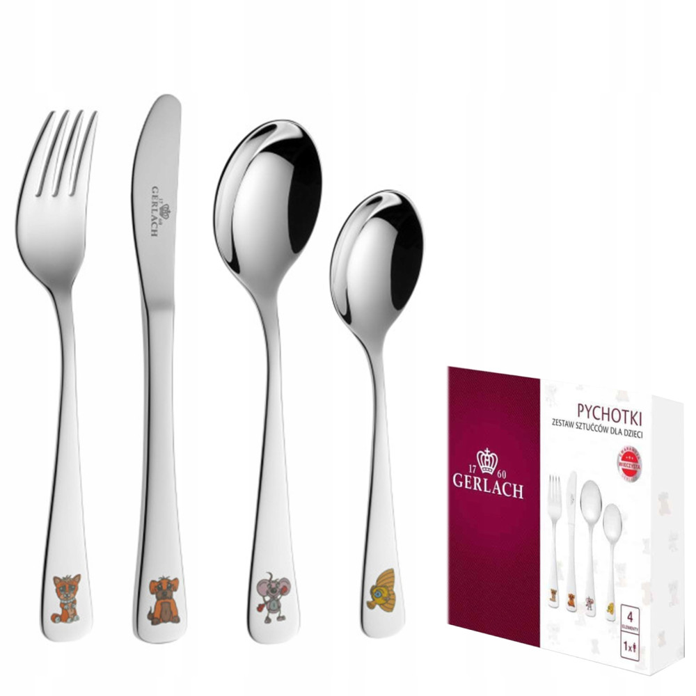 ZESTAW SZTUĆCÓW DLA DZIECI Poszukujesz upominku odpowiedniego z okazji Chrztu lub urodzin dziecka? Zestaw sztućców marki GERLACH będzie niezapomnianym, praktycznym i trwałym prezentem. W zestawie znajdują się wysokiej jakości sztućce takie jak: widelec, nóż, łyżka oraz łyżeczka. Każdy ze sztućców ozdobiony lubianym przez dzieci zwierzątkiem. Ulubiony zwierzak doda apetytu małemu konsumentowi.