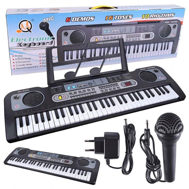 MQ 6119 to oferujący wiele ciekawych możliwości, a jednocześnie łatwy w obsłudze keyboard dla dzieci do zabawy i nauki gry na pianinie, w zestawie z mikrofonem, pulpitem do nut i zasilaczem. Instrument wyposażony jest w bank 16 instrumentów, 10 rytmów, 8 przycisków perkusyjnych, rekorder oraz 2 tryby lekcji. Może też pracować na bateriach.
