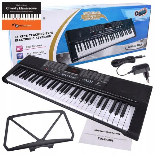 MK 2102 to edukacyjny, 5-oktawowy keyboard USB do nauki gry na pianinie, wyposażony w cyfrowy ekran, 61 pełnowymiarowych, fortepianowych klawiszy i 8-dźwiekową polifonię, 255 instrumentów, 255 podkładów rytmicznych oraz 50 utworów demonstracyjnych. Do tego obszerny tryb lekcji, funkcje kontroli ekspresji Sustain i Vibrato, tryb nagrywania i odtwarzania, a także wejście mikrofonowe, wejście audio i wyjście na słuchawki.