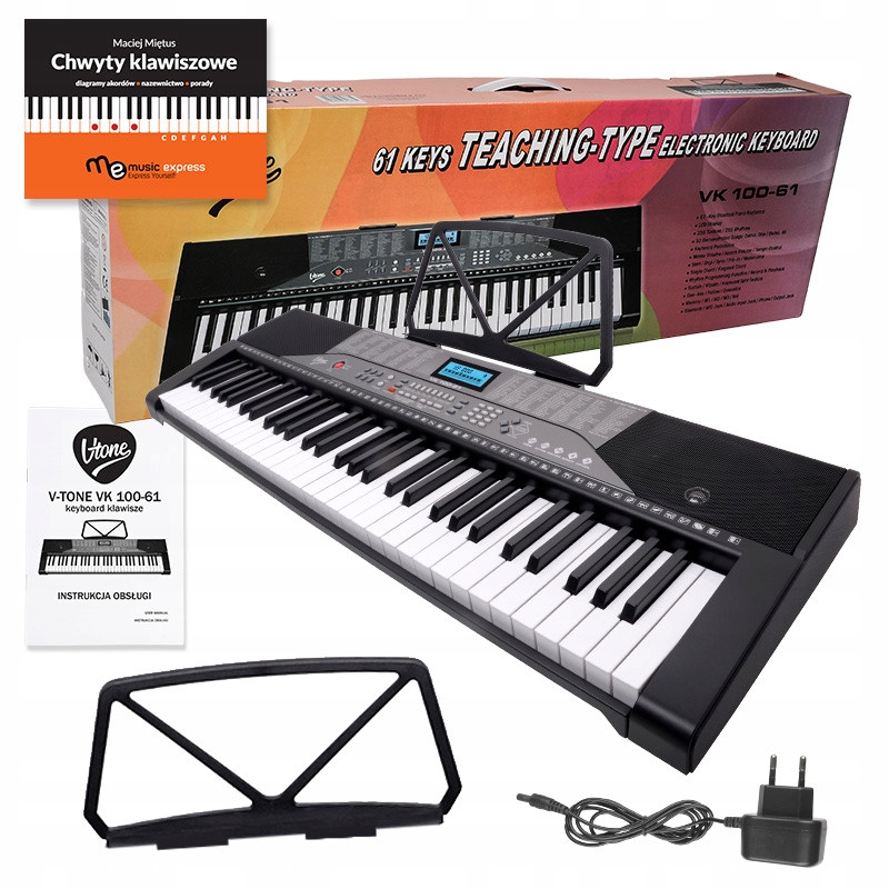 V-TONE VK 100-61 to edukacyjny ✅ keyboard do nauki gry na pianinie, wyposażony w cyfrowy ekran, 61 pełnowymiarowych, fortepianowych klawiszy, 255 instrumentów, 255 podkładów rytmicznych, perkusję oraz 50 utworów demonstracyjnych. Do tego obszerny tryb lekcji, funkcje kontroli ekspresji Sustain i Vibrato, tryb nagrywania i odtwarzania, a także wejście mikrofonowe, wejście audio i wyjście na słuchawki.
