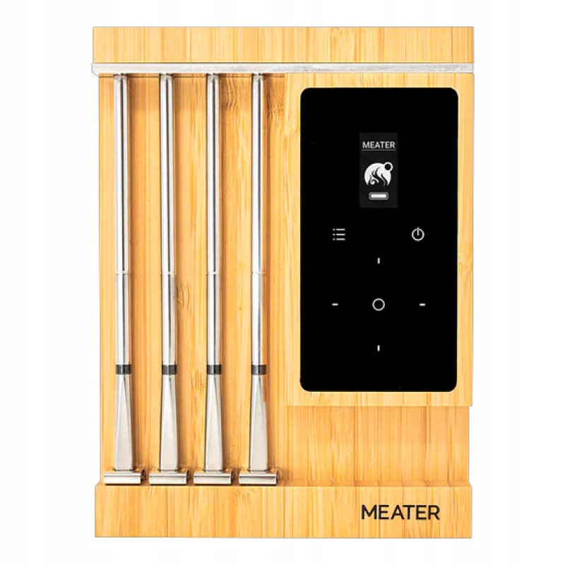 Bezprzewodowy termometr Meater Pro XL ułatwi Ci grillowanie mięsa tak, by było perfekcyjnie wypieczone, nawet jeżeli nie posiadasz żadnego doświadczenia. Termometr został wyposażony w cztery sondy, z któeych każda posiada sześć czujników - pięć do pomiaru temperatury wewnątrz potrway (do 105C) oraz jeden monitorujący temperaturę otoczenia (do 550C). Spndy zostąły wykonane z trwałej stali szlachetnej. Technologia Smart Temp Multisensor ustala najniższą rzeczywistą temperaturę w mięsie, pozwalając na osiągnięcie perfekcyjnych rezultatów za każdym razem. Darmowa aplikacja na iOS i Android umożliwia precyzyjne monitorowanie temperatury potraw w każdej sytuacji. Aplikacja oferuje funkcję ustawiania timerów, alterów, a także instrukcje gotowania różncyh rodzajów mięs. Bambusowa ładowarka posiada magnetyczne plecy, dzięki czemu możemy ją zamocować do metalowych powierzchni. Bateria zapewnia ponad 24 h ciągłej pracy - 5 minutowe ładowanie wystarczy na kolejne 2 godziny użytkowania.