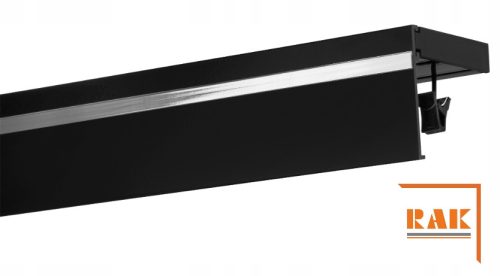 Karnisz sufitowy GALAXY składa się z szyny sufitowej PVC czarnej dwutorowej, przysłony aluminiowej czarnej lakierowanej proszkowo.Przysłony występują z paskiem dekoracyjnym w kolorach: srebrny mat, chrom połysk, biały, czarny, złoty. Przysłony mogą być również bez paska dekoracyjnego. Wysokość przysłony wynosi 75mm. Rozstaw torów w szynie PVC wynosi 34mm. W zestaw karnisza wchodzą również żabki w ilości 20szt na 1mb i zaślepki na otwory. Wszystkie te elementy są w kolorze czarnym.