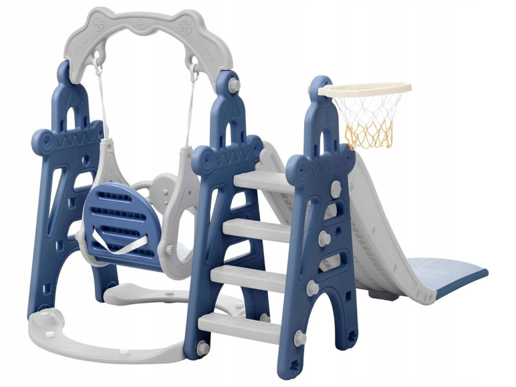Plastikowa zjeżdżalnia, niebieska, z huśtawką, z dwoma koszami do koszykówki, 180 x 190 x 123 cm - N