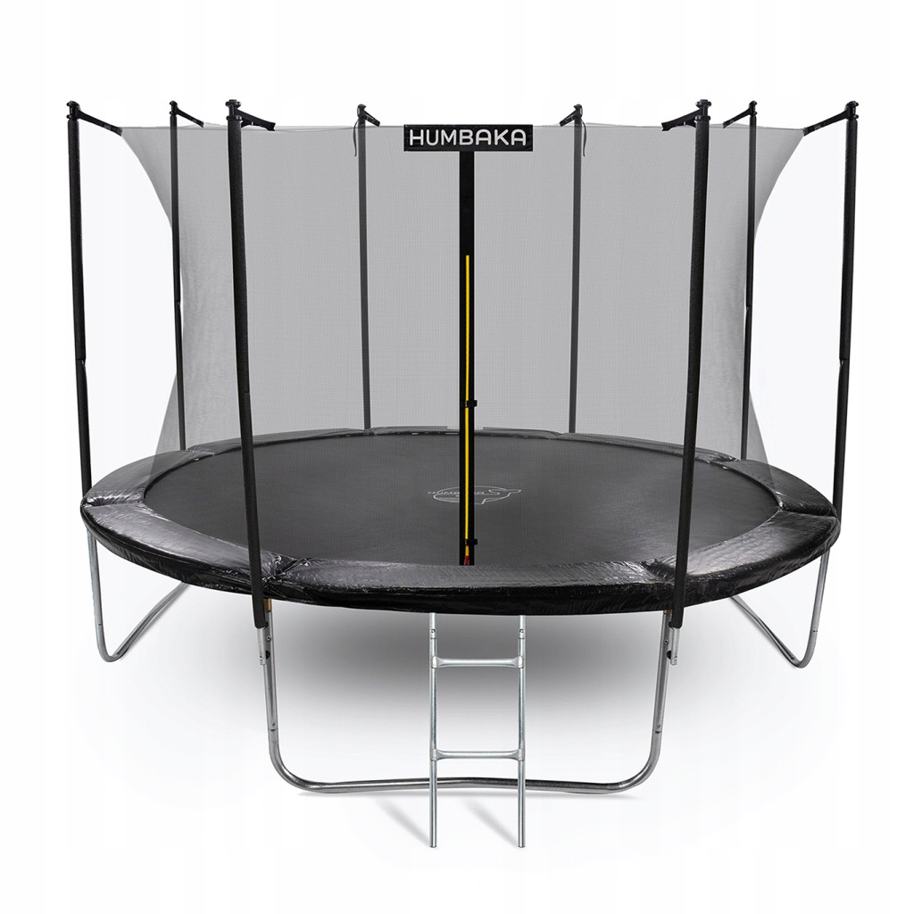 Trampolina ogrodowa HUMBAKA Eco posiada siatką ochronną o wysokości 180 cm, która jest mocowana wewnętrznie i zapinana na suwak. Ergonomiczna mata o średnicy 366 cm, a także stalowa rama oraz 72 sprężyny pokryte powłoką antykorozyjną i odporne na działanie wody czy promieniowania UV, gwarantują stabilność i wytrzymałość konstrukcji.