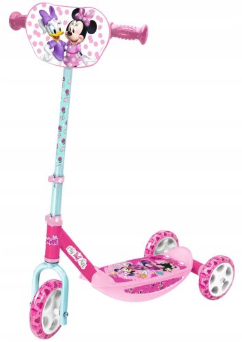 Hulajnoga jest koloru biało-różowego z dodatkiem brokatu, posiada grafiki z elementami przedstawiającymi głównych bohaterów bajki: Myszkę Minnie i jej przyjaciółkę Daisy.
